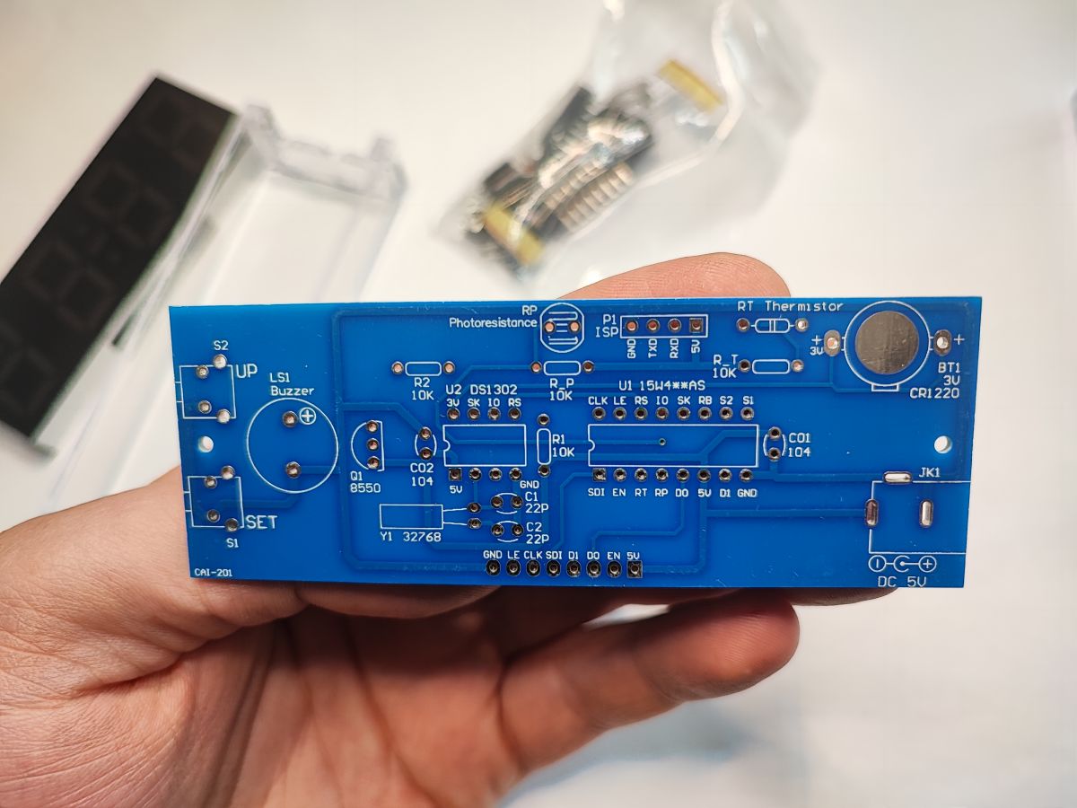 What kit for a beginner to learn soldering? Here is another simple and enjoyable kit - a clock with alarm and temperature measurement based on a large 7-segment display, all realised on a double-sided board based on through-hole assembly and available to buy for just under a dozen zloty.