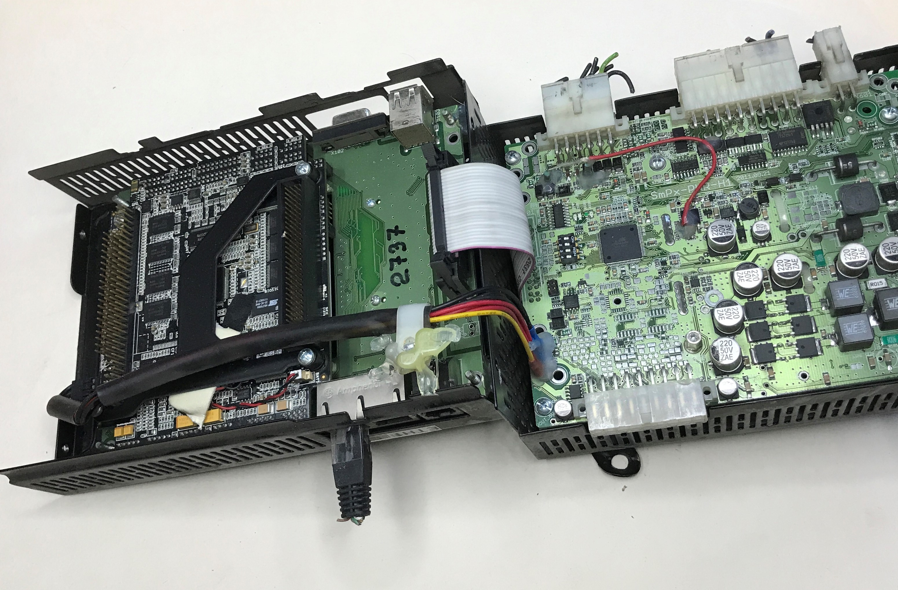 Here we have essentially three boards, the factory microcomputer module, its mother board (with, among other things, VGA output) and a board with inverters and (if I understand correctly) emergency backup on Li-FePO4.