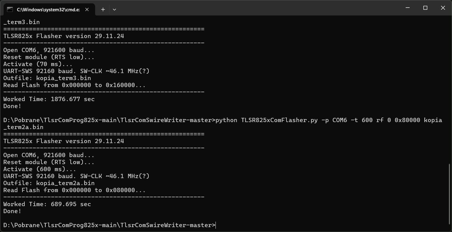 To do this I used https://github.com/pvvx/TlsrComSwireWriter and a USB-COM adapter on a CP1202 chip. I made a couple of copies and compared if I was sure the contents matched.