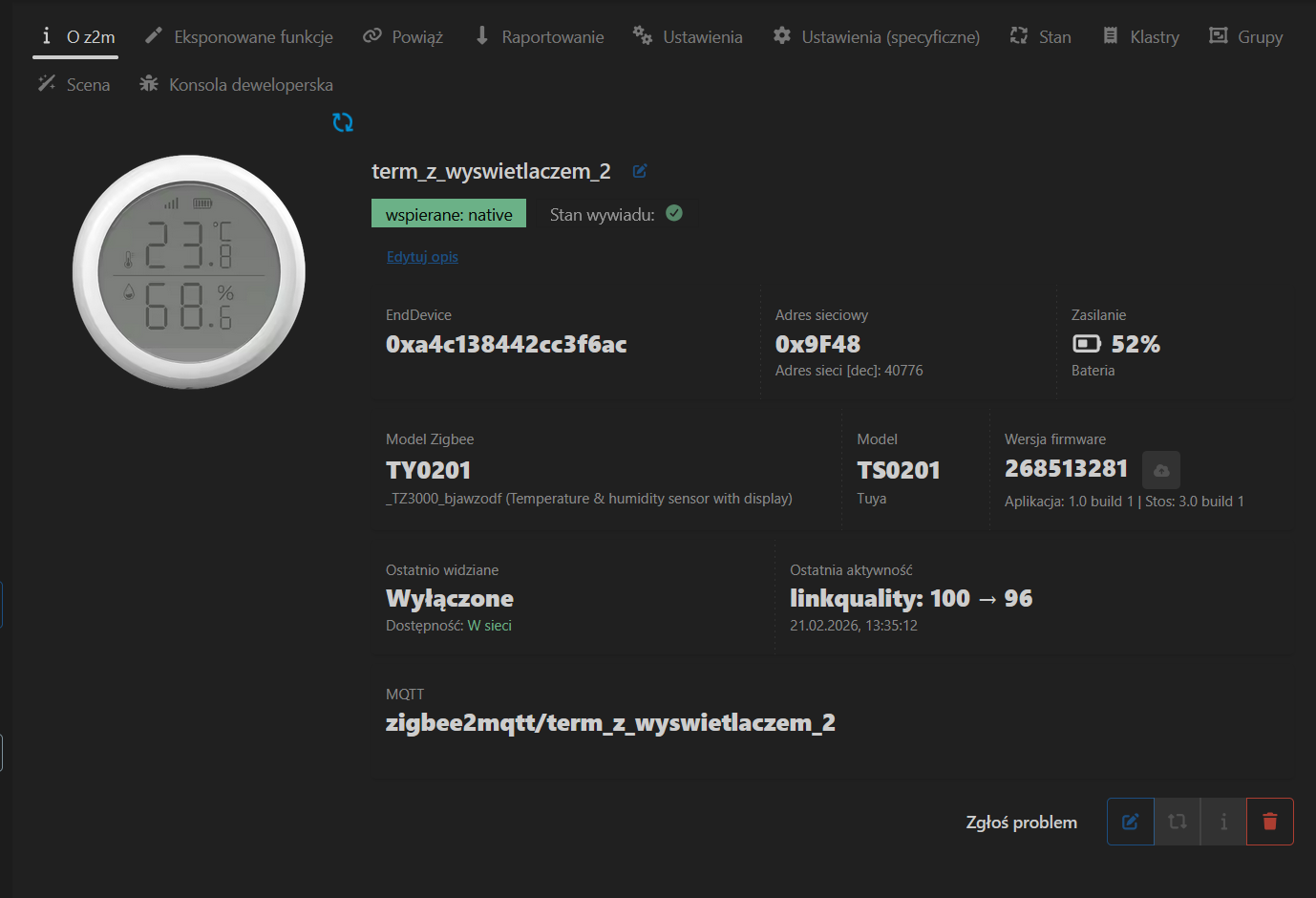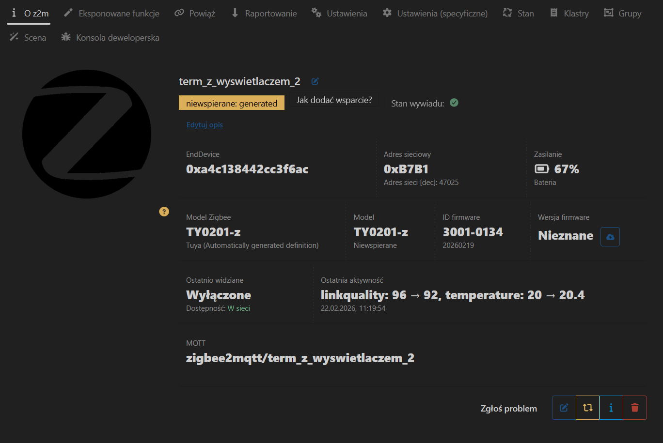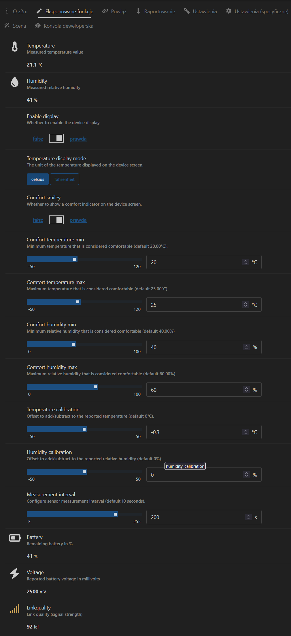 At the moment, however, I don't have any settings available, and there are quite a few in this firmware, such as calibrating the display - both on the display and via Zigbee, setting the update frequency or disabling the display.