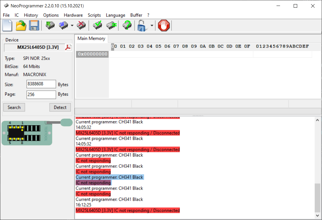 You have connected the flash memory correctly to the CH341 programmer, but the PC program does not recognise it at all? NeoProgrammer shows IC not responding, is the chip faulty? The Read ID operation (reading the flash ID) returns 0xFF alone? Don't give up - here I'll show an unusual case demonstrating well that some memory chips simply don't support read ID and yet you can rip data from them.