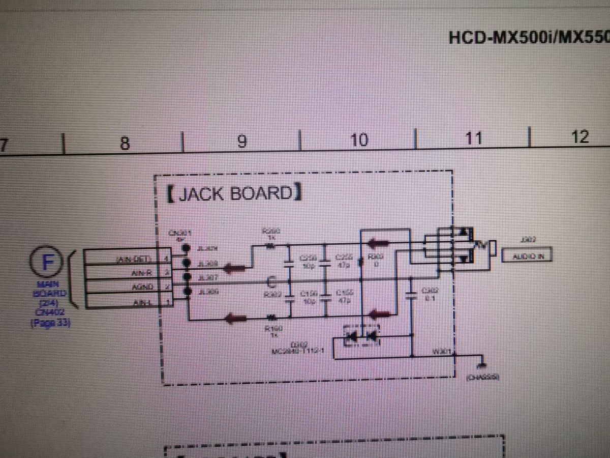 Initial assessment of your photos and notes - Your board is clearly marked “SONY – PWB JACK – 1-882-119-11” and “AUDIO IN J302.” That matches the HCD‑MX500i/MX550i Hi‑Fi “JACK BOARD” used in the CMT‑MX500i micro system. The service manual shows the same board outline, the 4‑pin harness CN301, and labels AIN‑L, AGND, AIN‑R, and AIN‑DET leading from the audio jack to the main unit. (manualmachine.com) - On that board, component J302 is specified in the parts list as “JACK (AUDIO IN) – 1‑815‑629‑21.” In other words: it is a 3.5 mm stereo “AUX” jack with an insert‑detect contact, not a USB connector. (manualmachine.com) - The product specification confirms the input is a “stereo mini jack (Audio In).” (manualmachine.com)
