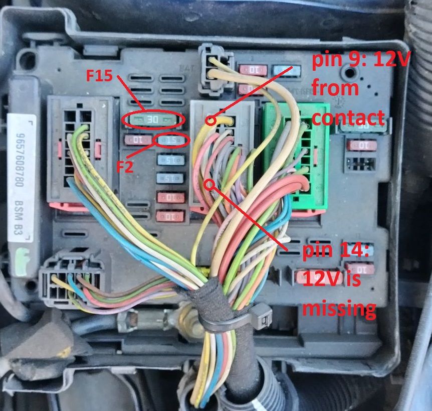 On the BSM of my Peugeot 206 1.4 HDi, 2004, on fuses F15 (30 A) and F2 (15 A), I have no power when I turn on the ignition. The relay does not turn on. That is why the ECU has no power, and I cannot start the car. It turns over but does not start.