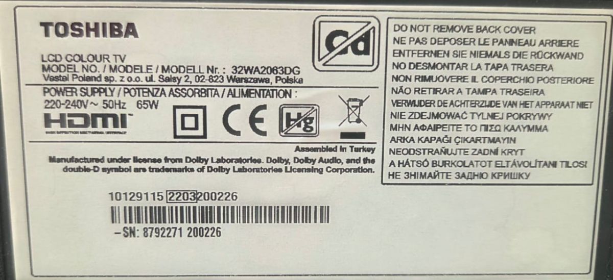 Model: Toshiba 32WA2063DG