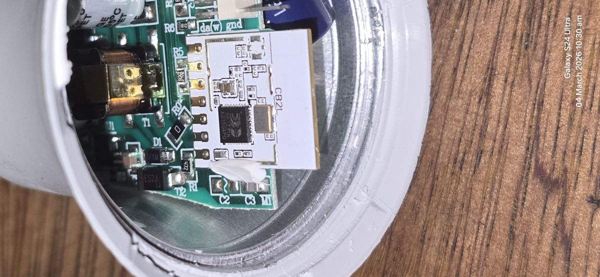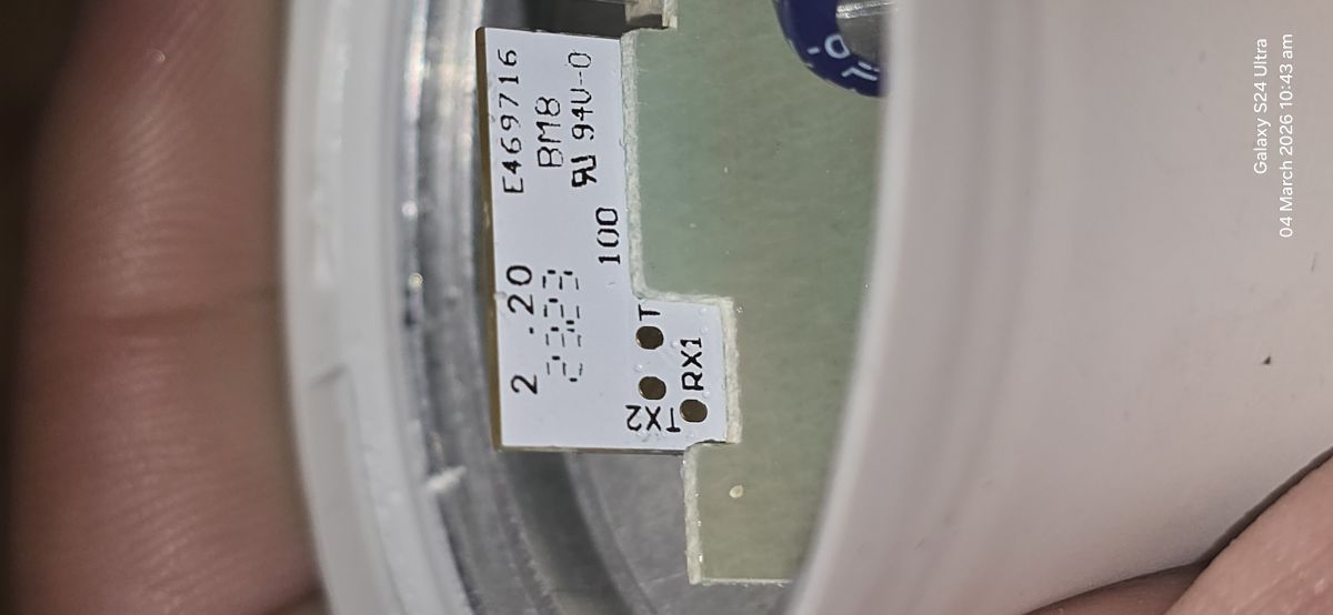 RX1 and TX1 are accessible after removal of LED board, no need to desolder anything, or pull the boards out - i don't recommend that as pins at the base may not catch the wire properly (i had to make one of the solder), but i provided external 3.3V using my PSU set to 300mA as my USB-TTL can only handle 100mA I used the one on the picture.