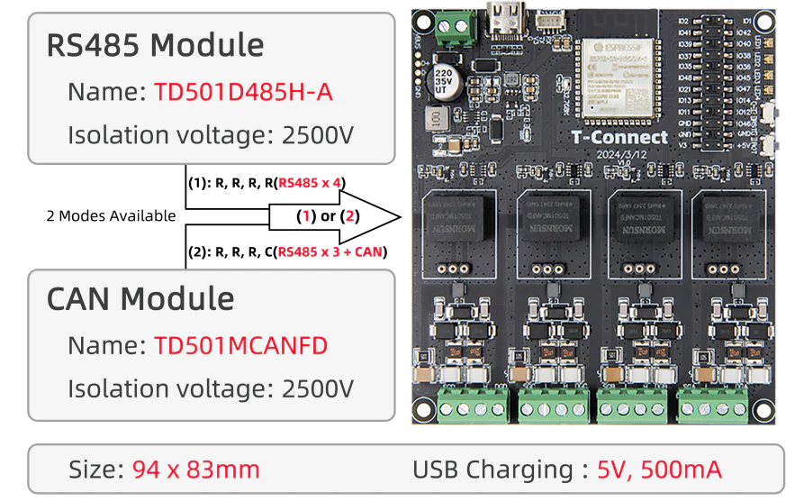 RS485 is supported by the TD501D485H-A and CAN by the TD501MCANFD, both with insulation up to 2500 V.