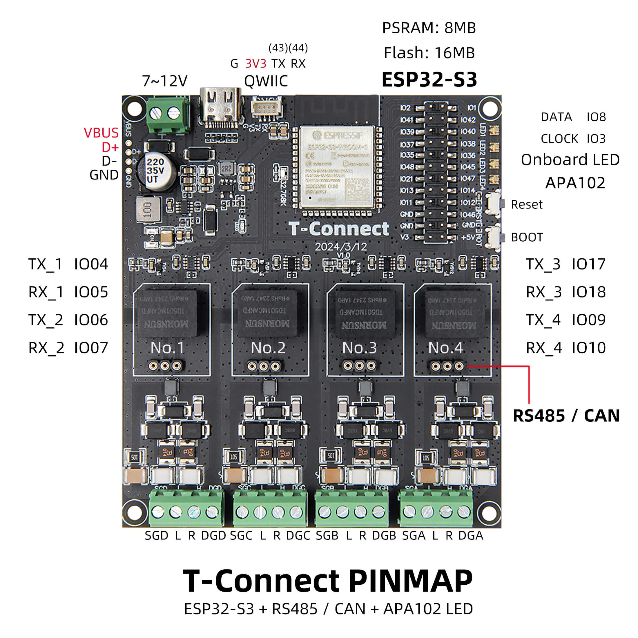 Very nice board, I also like the modularity for CAN and RS485, although it's a bit of a shame that ESP hardware only has three UARTs, so you won't be able to have four RS485 active at once. In addition, I like the conveniently routed GPIOs and up to four coloured LEDs, on which you can conveniently show various operating and error statuses.