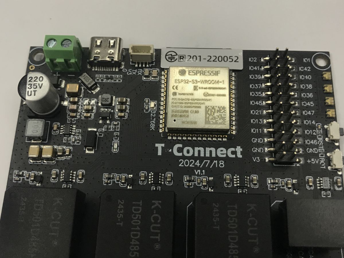We open the distinctive box and pull out the plate. What immediately catches our eye is the ESP32-S3-WROOM-1 module which is the heart of the T-Connect, here in the N16R8 version, i.e. with 16 MB Flash and 8 MB RAM.