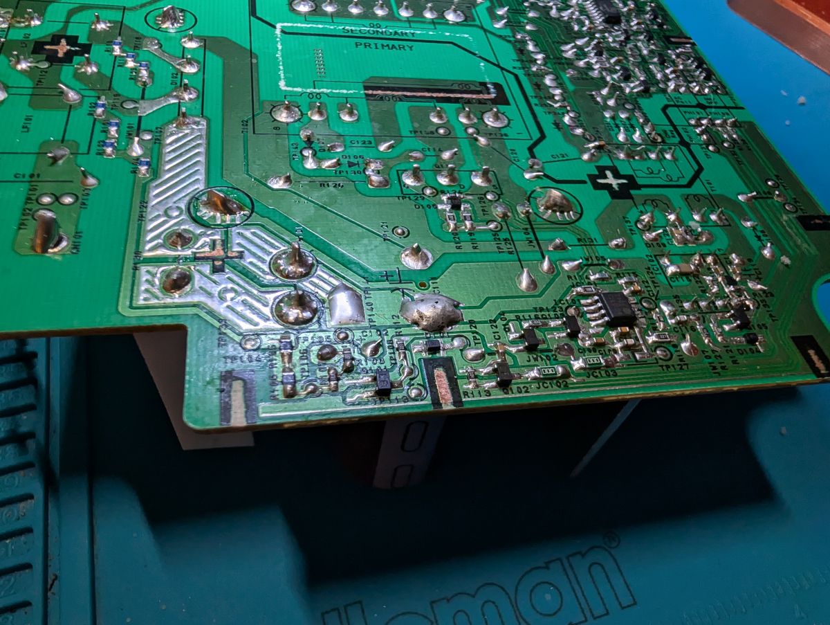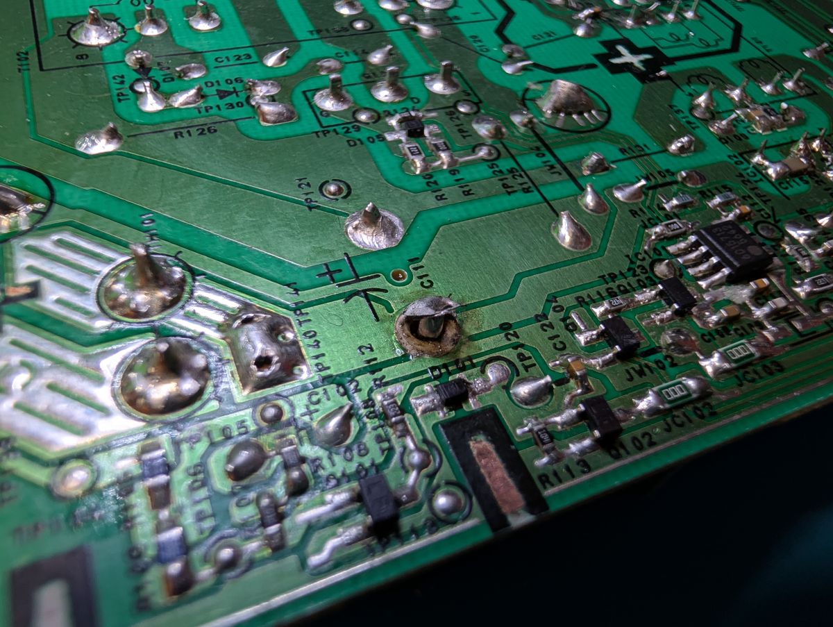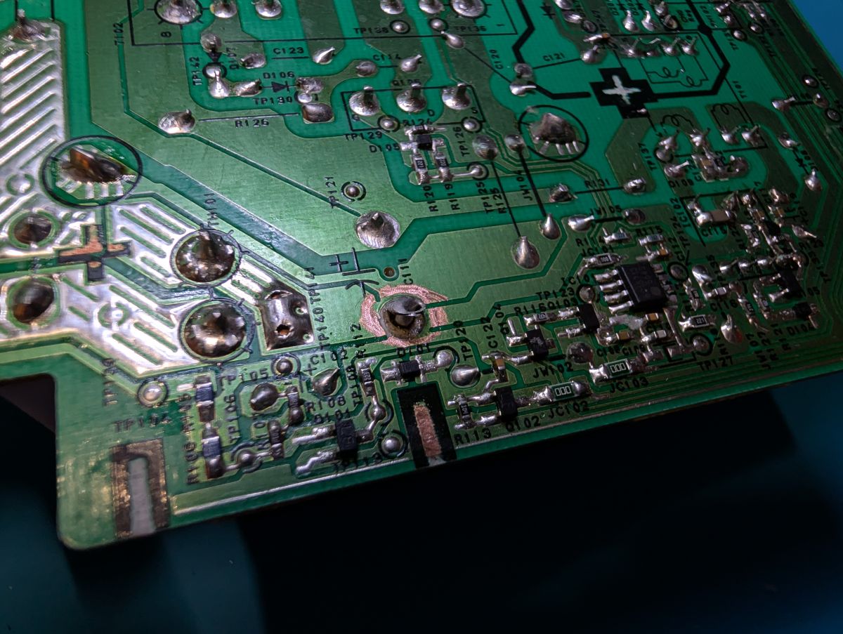 And guess what: the overvoltage had cooked the negative pad off of the main electrolytic cap negative trace. And this trace has a junction to all different points directly where the cap comes through (makes sense as a star point).