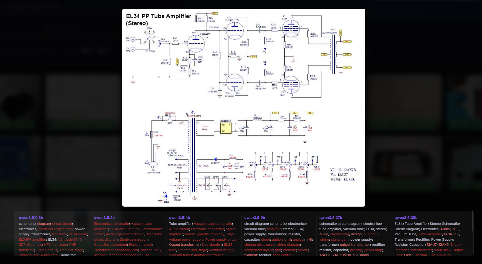 It was simple, but still good to know that even the 0.8b model read the EL34 name correctly. The rest of the tags are right on target too, there are terms there that mainly just fit the schematics. The two largest models also read 12AU7. Overall, I find it hard to point out anything quite nonsense there.