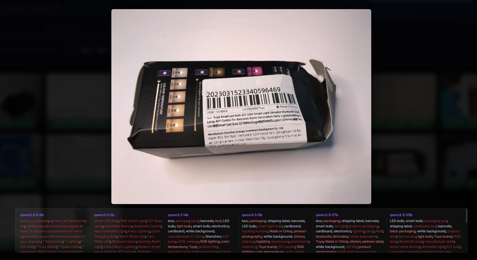 Here the striking part of the 0.8b model's verbal response is that instead of providing the tags themselves, it started the response with its introduction. The plus side, however, is that the tags are largely all correct, even the weakest models recognised that this was the E27 standard. They probably read from the text.
