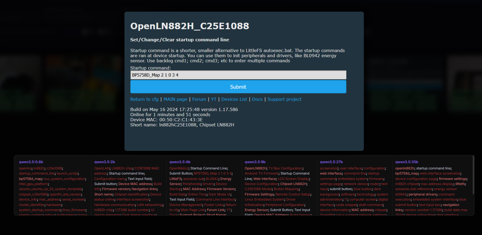 screenshot; user interface; configuration; web interface; command line; startup command; embedded system; firmware; settings page; network device; router; text input; submit button; blue button; dark background; software; technology; system administration; IT; computer screen; digital interface; code snippet; shell command; device information; MAC address; chipset; OpenWrt; Linux system; network settings; peripheral drivers