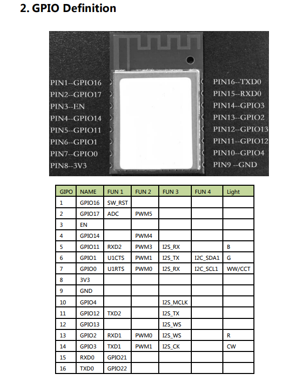 The module is signed as MRE3S_Rev3.0. The name suggests that this is a module manufactured for/by Meross. The 3S designation matches WB3S/TYWE3S and indicates the format of the module. I couldn't find any more information about it except for the FCC report, which did however clarify a bit about the pinology: