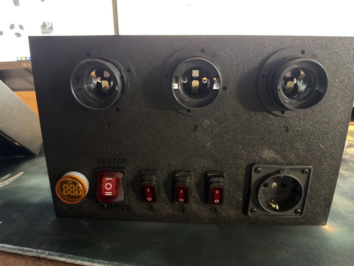 2. Assembly: All components (sockets, panel) are mounted with M3 screws screwed into brass inserts molded into the plastic. This avoids the threads becoming worn in the print.
