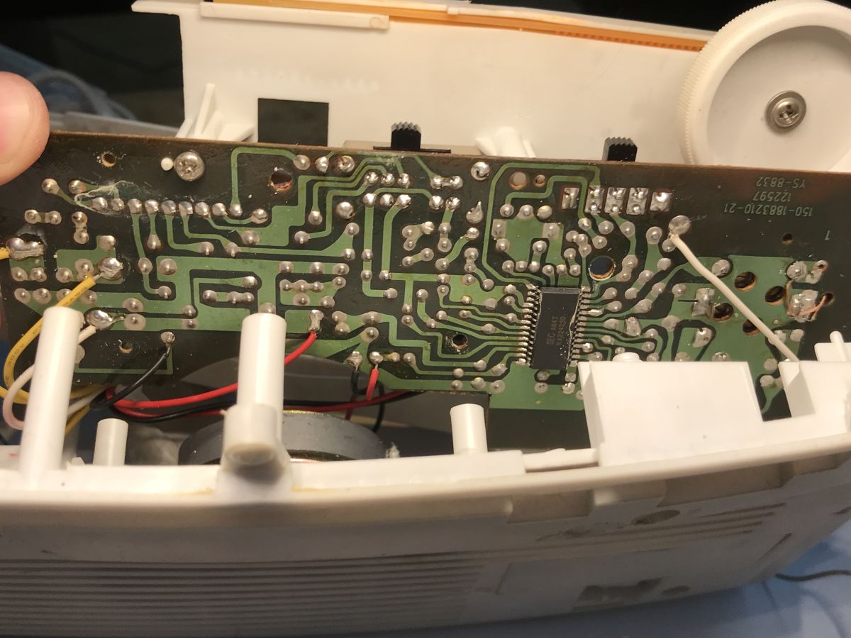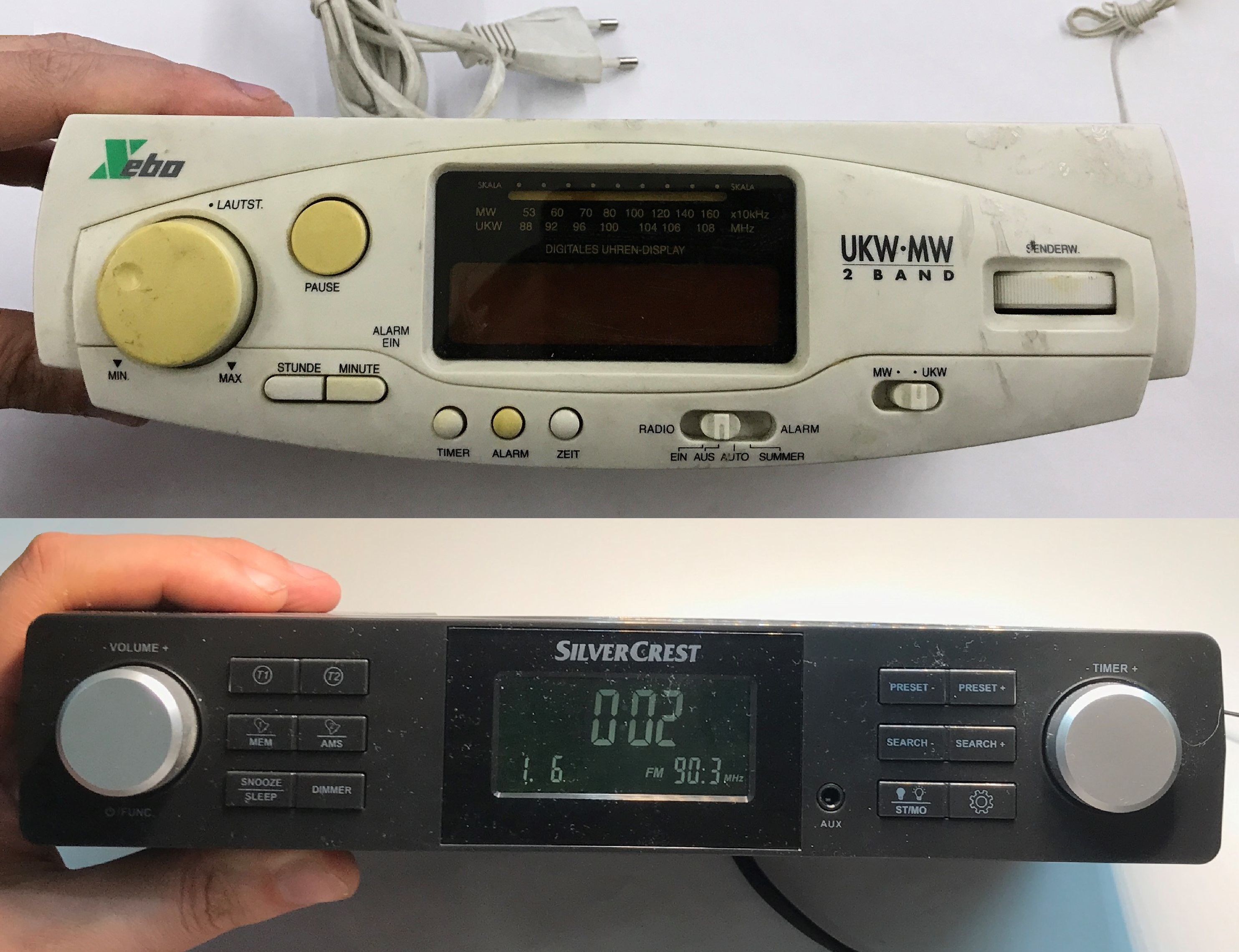 - degree of digitalisation - the older unit uses a simple analogue AM/FM radio path working with a clock chip (LM8560). The newer model is dominated by digital electronics: the radio receiver is integrated in a single chip (C9636), controlled via an I2C interface and offering functions such as RDS or automatic station search.