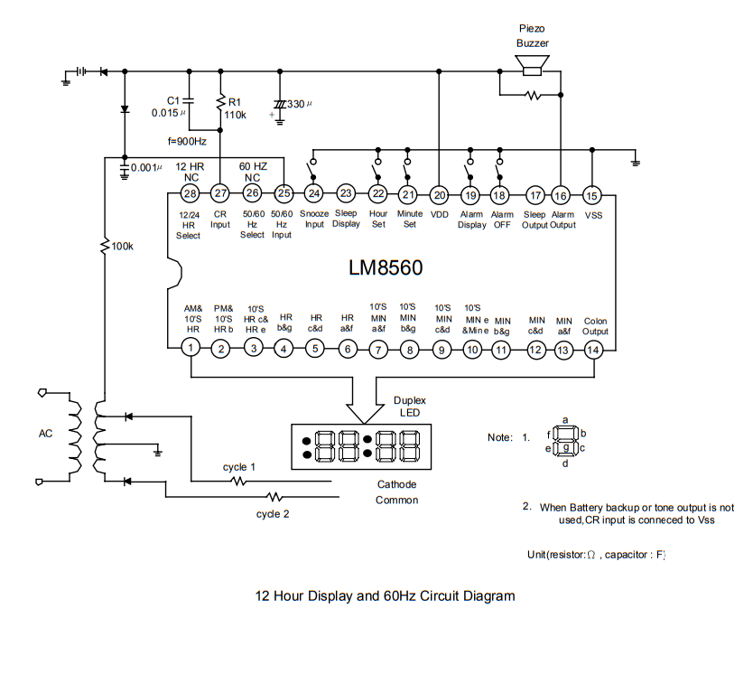 The LM8560 handles pushbuttons, display and timing. Timing is clocked by the frequency of the mains through a transformer and, in the event of a power failure, is sustained by the battery through a simple RC generator. The LM8560 can switch the radio on and off when used as an alarm clock.