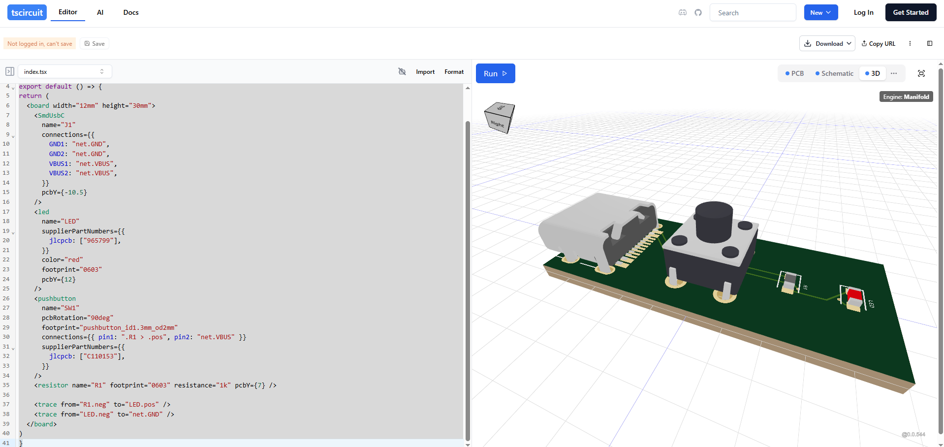 An interesting project is gaining popularity on site X tscircuit , which combines frontend web technologies (React + TypeScript) with electronics design. The idea is simple: instead of classic CAD like KiCad or Altium, we write the circuit as JSX code. The electronic components are represented as React elements, such as a resistor or capacitor. The code is processed into a circuit structure (JSON) and then rendered and prepared for further stages. The project has modules for previewing the circuit directly in the browser, also in 3D form. All this is live, with no delays or charges. The current version is fully functional and allows you to create your own tiles, although it does not yet include full systems such as ERC and DRC. Export to Gerber format is supported, however, and the author has already demonstrated the full process of creating a tile including ordering it from JLC. For a simple project, you can fit in just 40 lines of code.