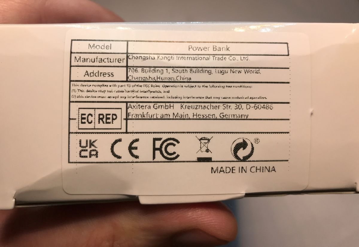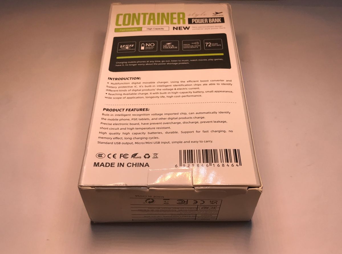 Look in vain on the casing for information about the model of the powerbank. According to the sticker, the model is simply "Power Bank". The "Container" on the packaging is already some kind of a nameplate.