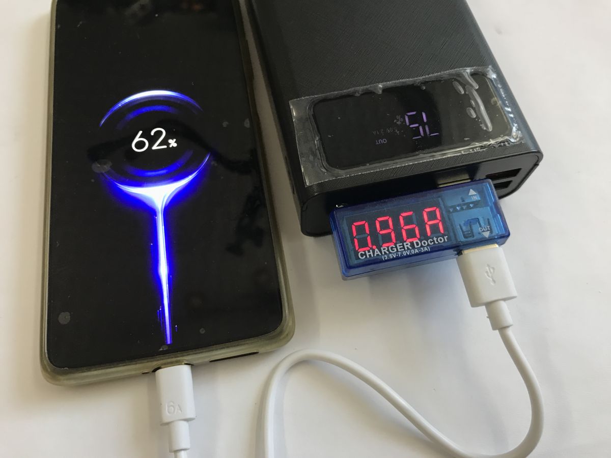Charging is done with a current of just under 2 A. Charging from 0 to 100% shows on the meter less than 16 Ah drawn (at 5 V).