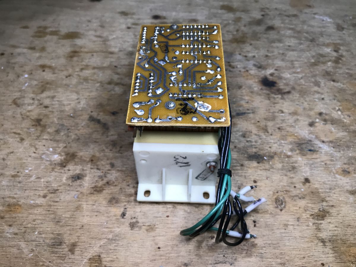 Dismantling of the board, on which a rectifier bridge, a large electrolytic capacitor and characteristic resistors can be seen. Although the time setting itself is mechanical, the counting is already carried out by a semiconductor.