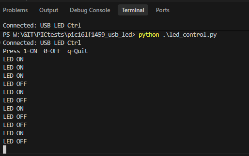 Overall, running USB on the PIC16LF1459 in the SDCC compiler requires proper configuration of the registers responsible for this module and defining basic descriptors for the device, configuration and interface in the HID class. Hardware-wise, the PIC relieves us to a large extent, e.g. with the Active Clock Tuning (ACT) function, which, through continuous synchronisation to USB frames (SOF), allows a stable 48 MHz from the built-in internal oscillator, but we have to program the descriptors ourselves. In the C code itself, handling the diode control is reduced to intercepting SET_REPORT requests on the control endpoint (EP0) and reading the sent data byte. To connect to such a configured device on the computer side, we can use a short script in the system Python based on the HID library, which, due to the use of the standard HID class, works "out of the box" and does not require the installation of any additional drivers in the operating system.