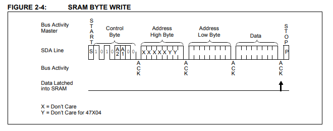 Now that we have I2C, we now need to do the communication with the memory - but this too is very simple, for example writing a byte is basically just establishing an I2C connection (after the memory address), specifying the address where we are writing (two bytes) and the destination data byte.