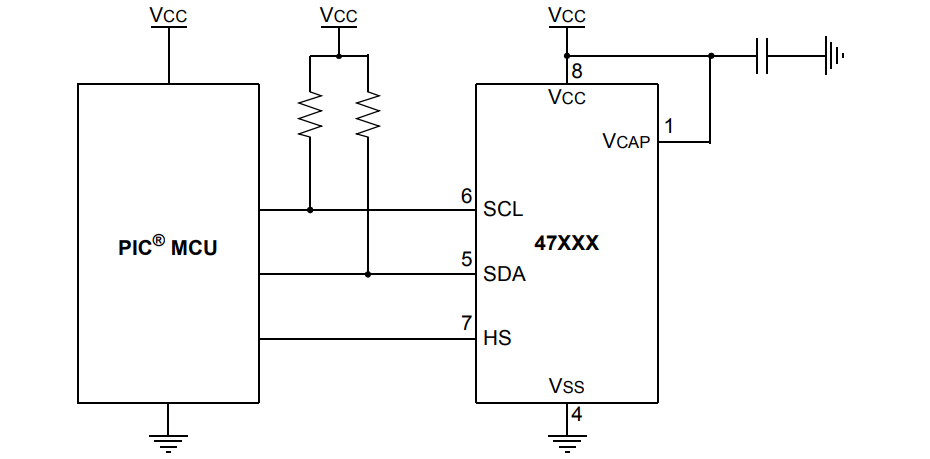 the 47L16 is connected to the PIC via the I2C bus. Two signals are needed, SDA (data) and SCL (clock), both with pull-up resistors for power supply.