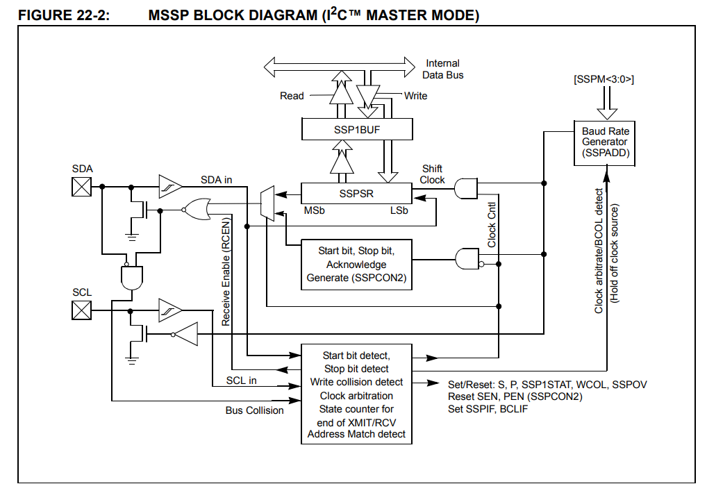The PIC in question has hardware I2C, this means that we no longer have to manually swipe pin states using loops and delays in the program code. The microcontroller is equipped with a dedicated MSSP port system, which generates clock and data signals on the SDA and SCL lines independently and without our involvement. We only need to write a data byte into a special register (SSP1BUF) or issue a command by changing a single bit (e.g. SEN), and the rest of the work is taken over by the electronics. In this way, our task is virtually reduced to loading the data and waiting in a short loop until the hardware module signals that the sending is complete. Example implementation: