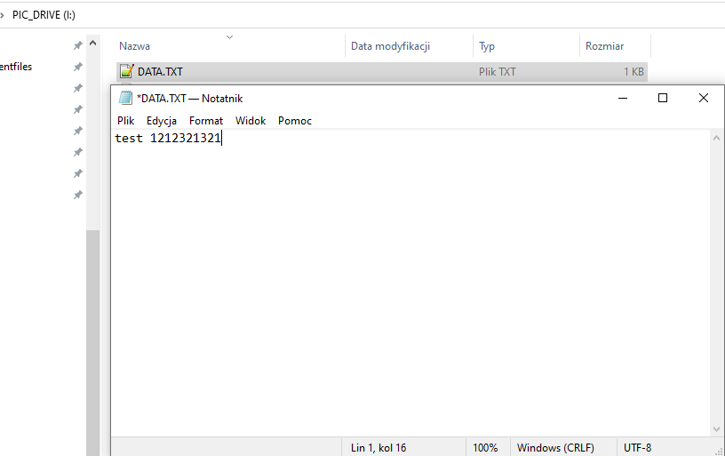 A flash drive prepared in this way is able to write a string of characters to a text file; moreover, the characters are able to survive a PIC reset and a complete power cut. On a side difficulty, I see that my Notepad++, after reading the file, sees additional NULL characters (null bytes) after the typed phrase, but I haven't diagnosed this - it probably doesn't respect the length of the file.