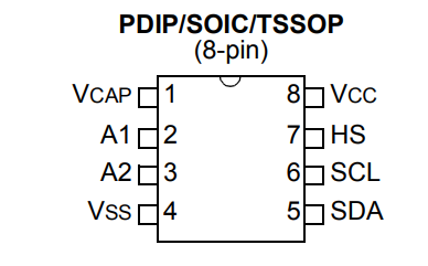 The HS pin forces a write (hardware store), but we can skip it here. I have connected it to ground. In addition, we have two more power pins, the mentioned ground and the address pins - these have internal pull down resistors, so I didn't even connect them.