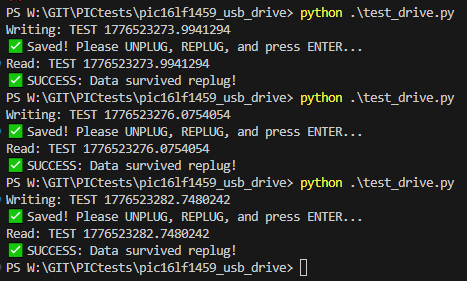 In summary, creating your own pen drive substitute on an 8-bit PIC boils down to simulating a functional storage medium complete with a mock-up file system and sector access. In the case shown here, such simulation is limited to feeding rigidly prepared, residual FAT12 headers and arrays, crafted to pretend to be a storage medium with a single file on a well-defined sector. Reads and writes from this sector are intercepted and redirected to the EERAM, which is fortunately fast enough to write and read without interfering with the PIC's communications.