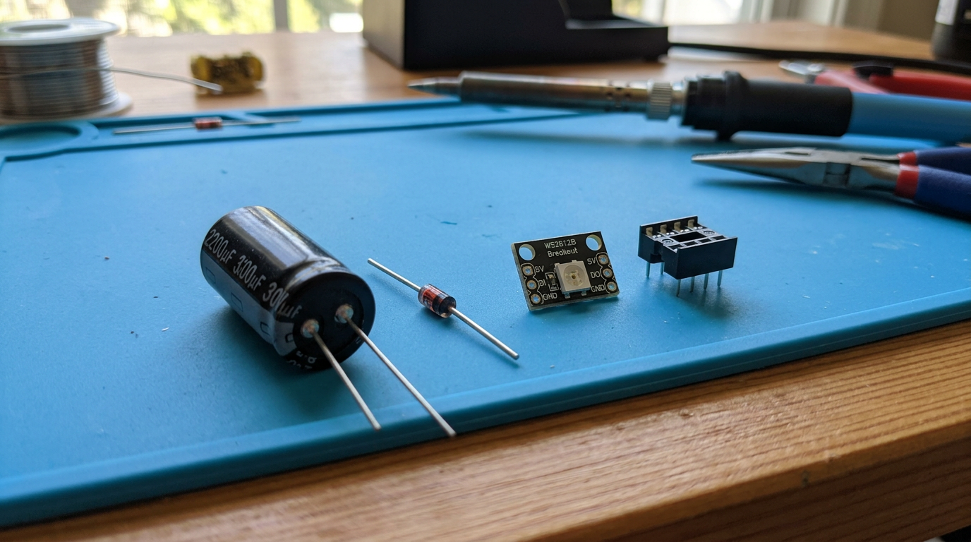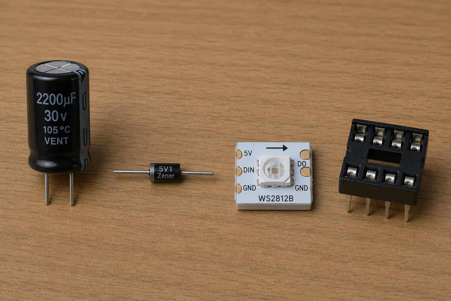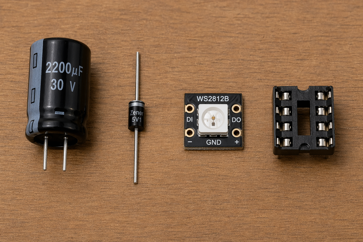 Draw four elements on table: a 2200uF 30V capacitor, a Zener diode, a WS2812B single module, and a DIP8 socket