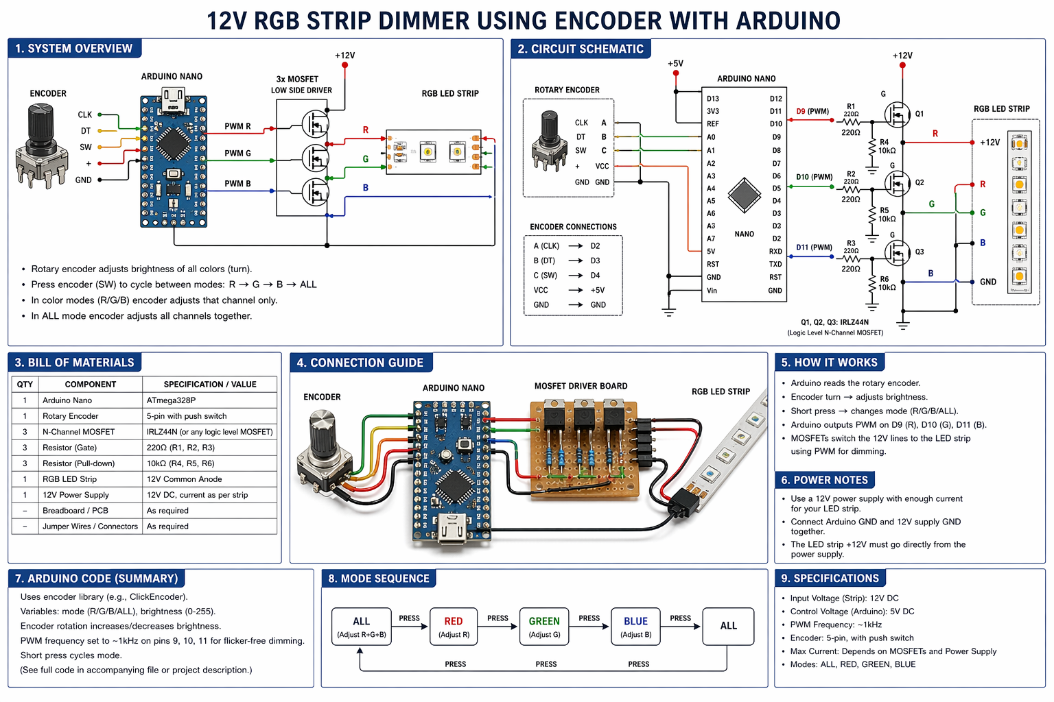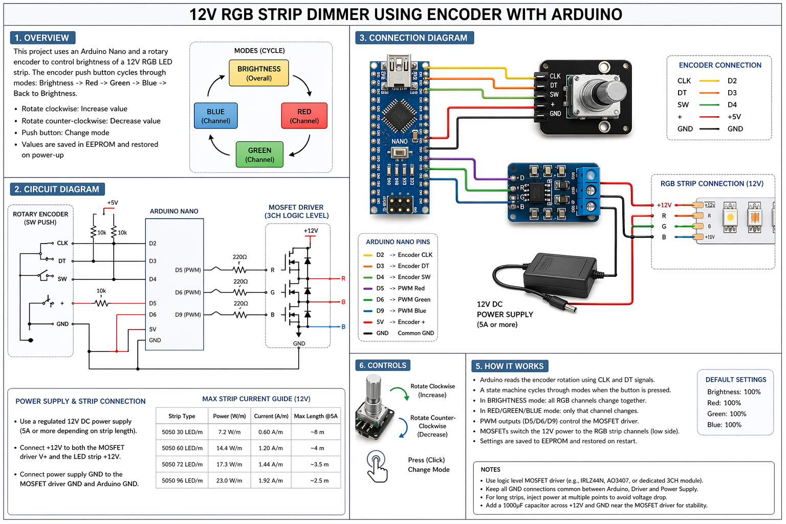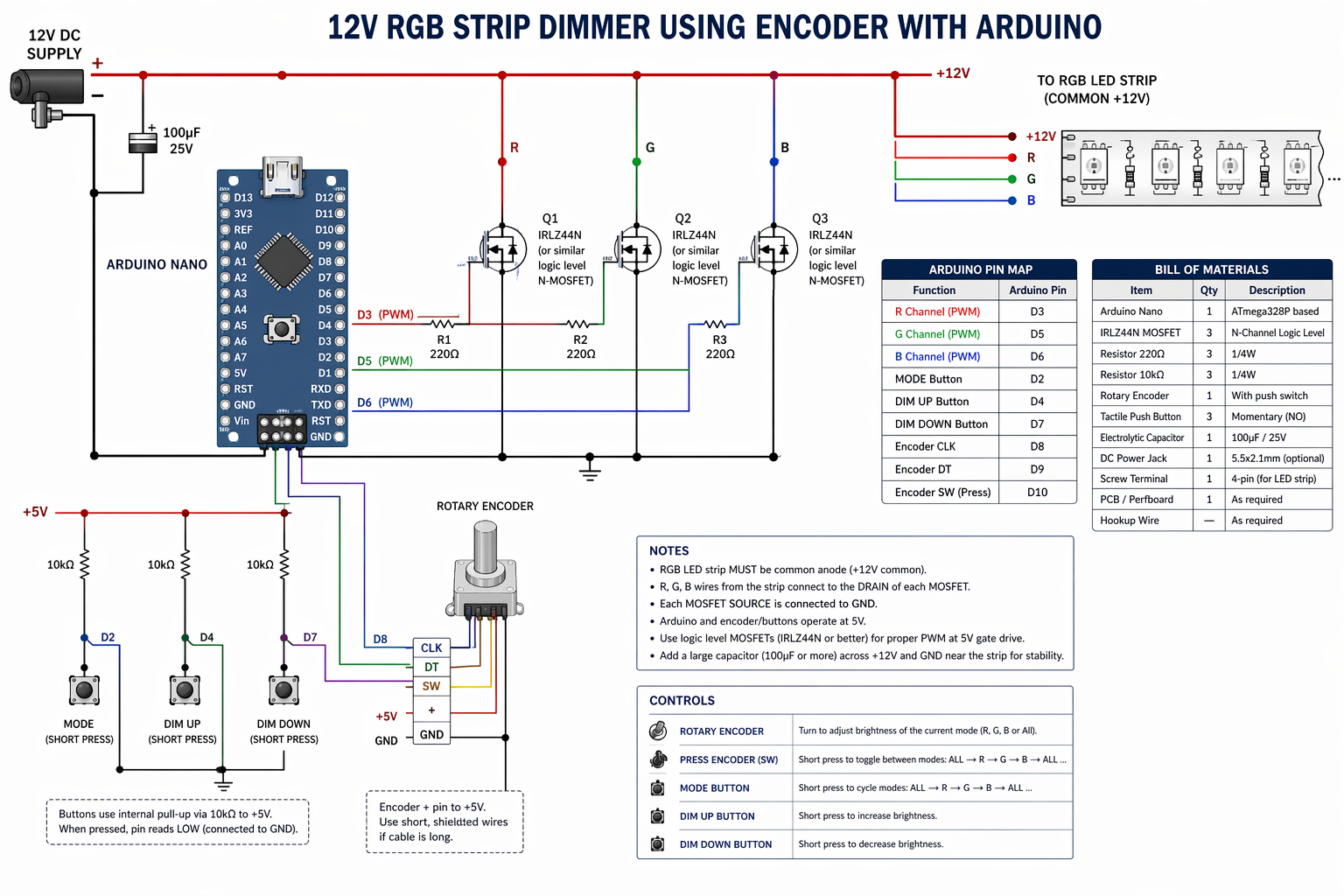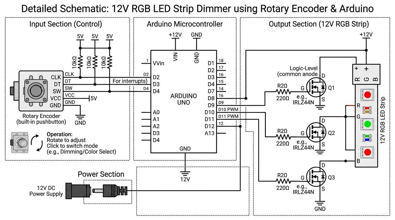 draw detailed schematic showing how to make a 12V RGB STRIP DIMMER using encoder with Arduino