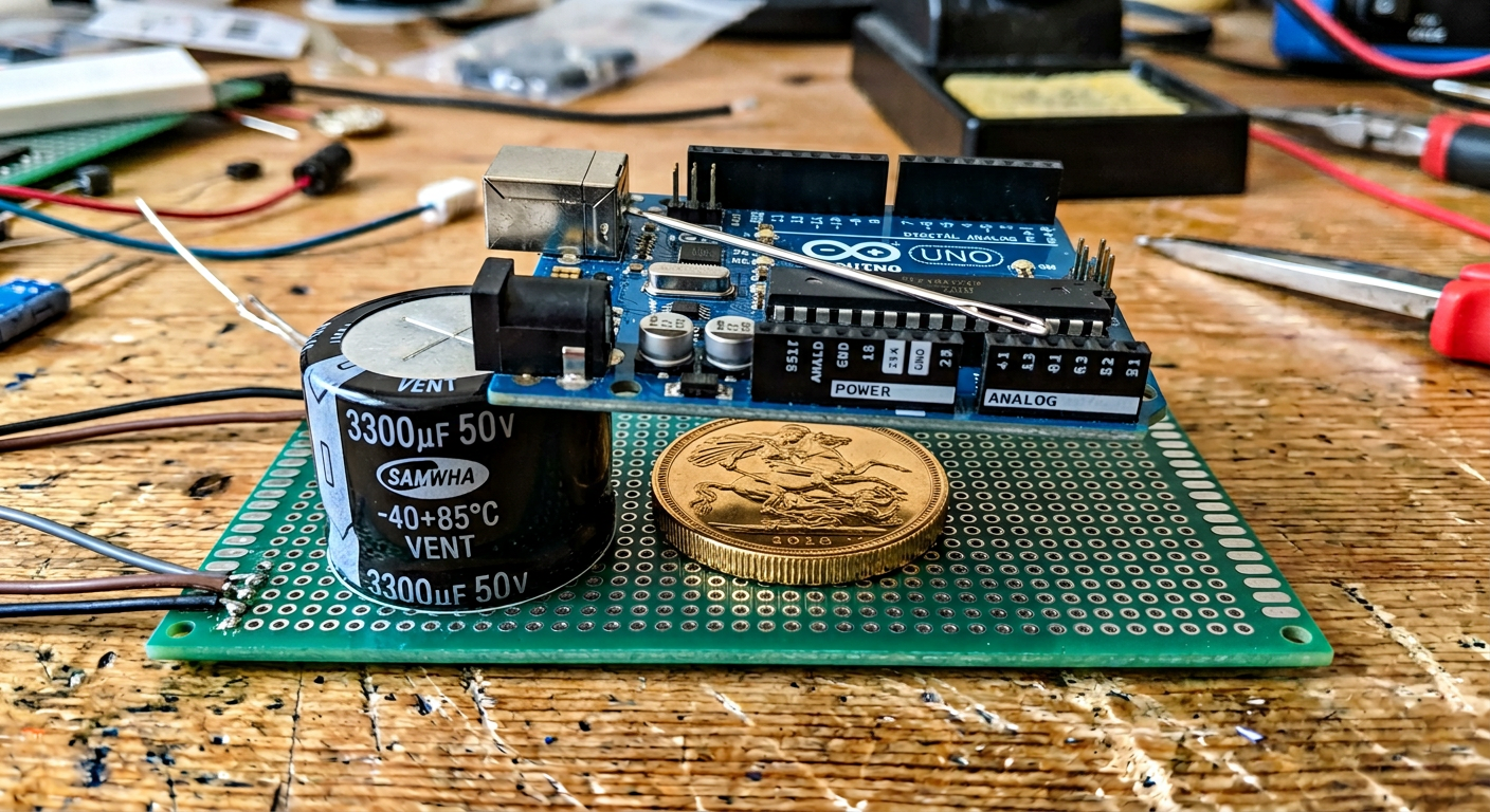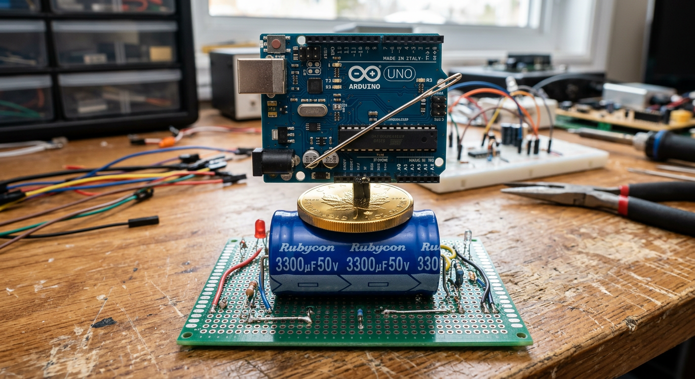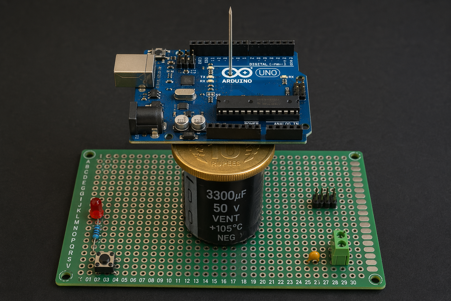 draw a proto board with 3300uF capacitor 50V on it, on capacitor put a gold coin, on coin put an Arduino UNO, and on Arduino UNO put needle