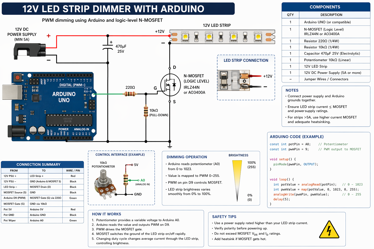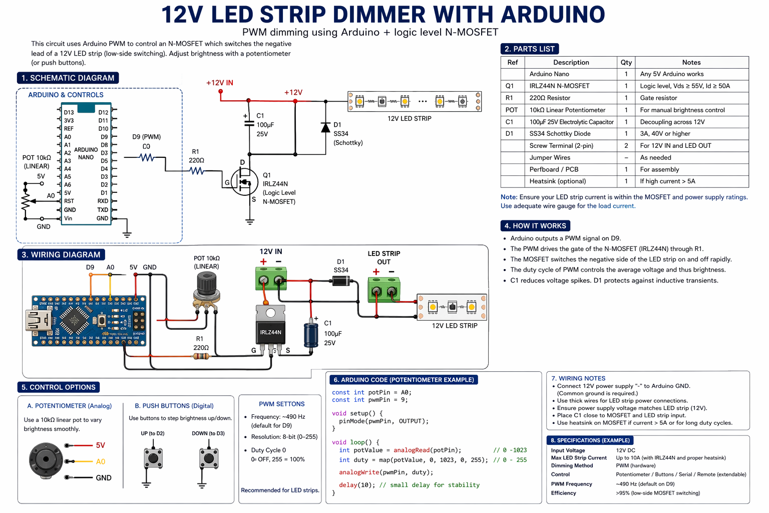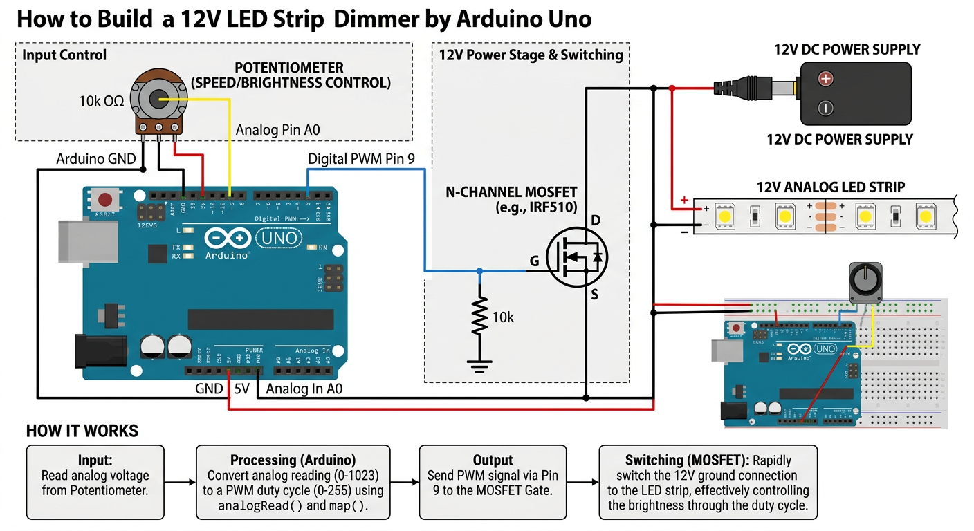 draw detailed schematic showing how to make a 12V LED STRIP DIMMER with Arduino