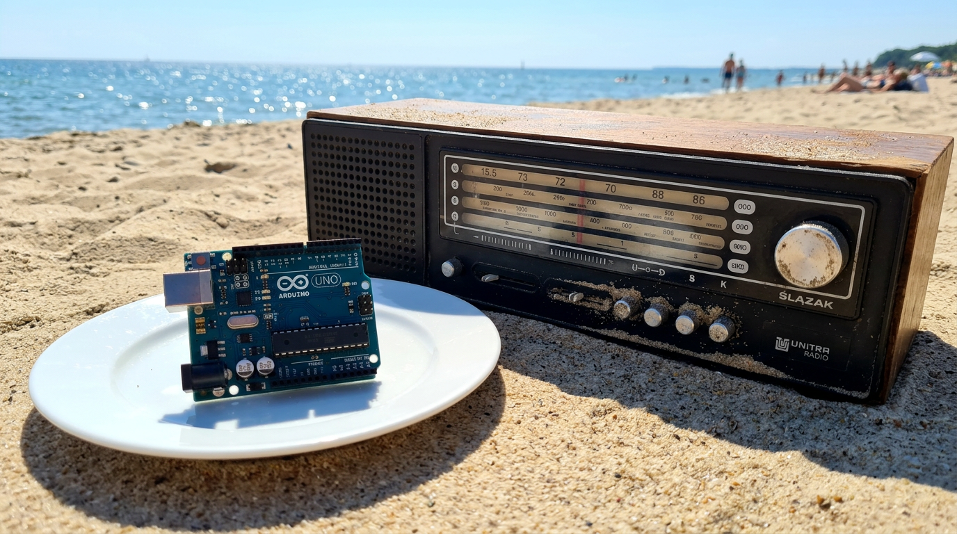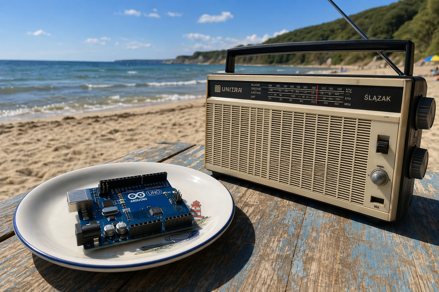 Arduino UNO on a plate, next to old Unitra Silesian radio on beach during sunny day