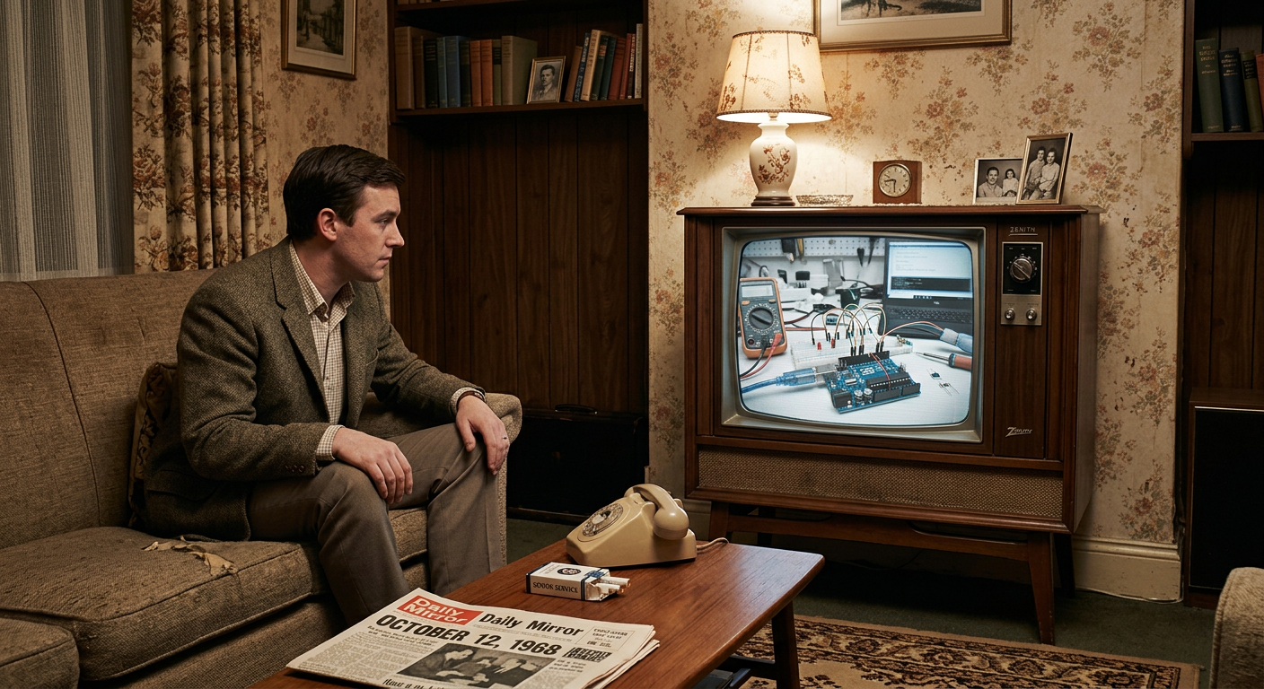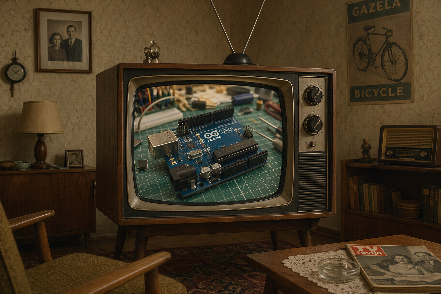 1960 old room with TV showing modern Arduino UNO in workshop