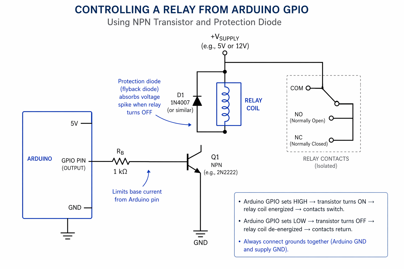 a schematic showing how to control relay from arduino GPIO with a transistor and protection diode
