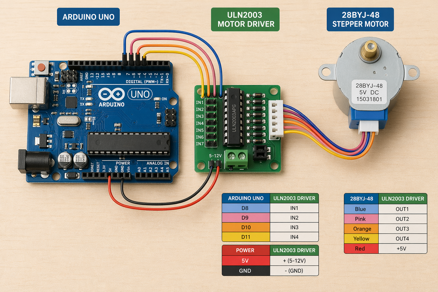 Arduino UNO with 28BYJ-48 and motor driver connect by wires