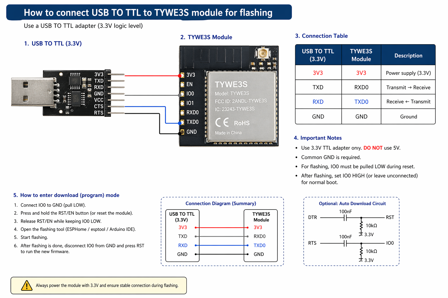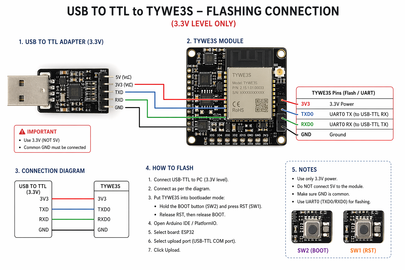So how to connect USB TO TTL to TYWE3S module for flashing?