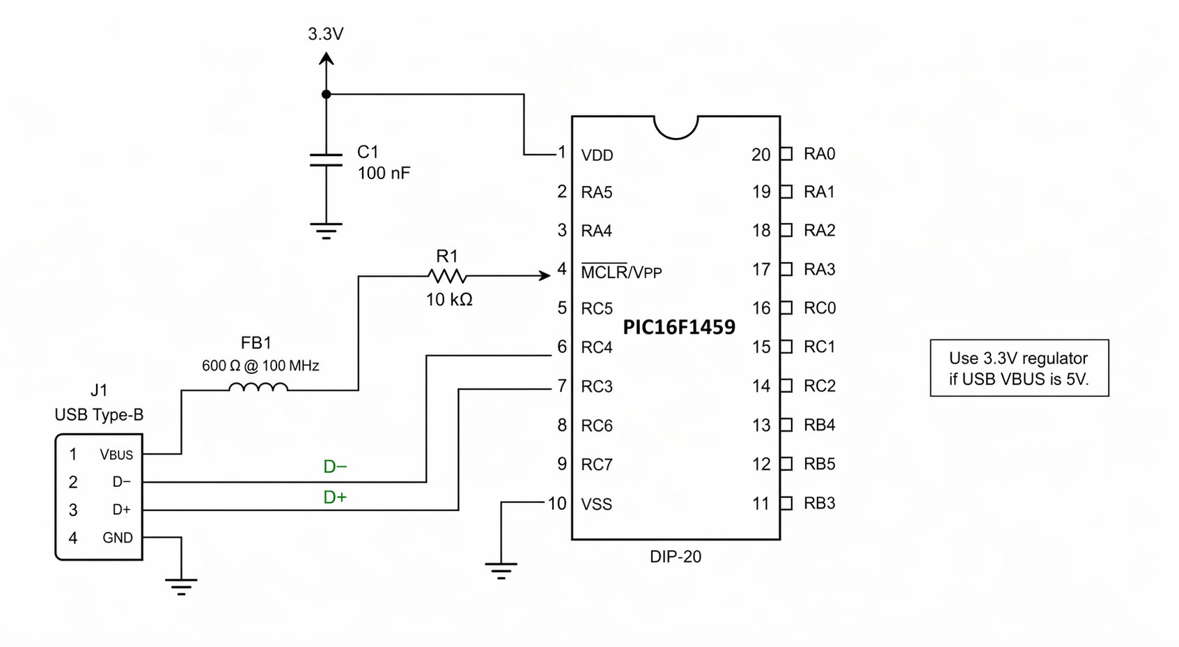 show minimal connections of PIC16F1459 in DIP package schematic with USB connector